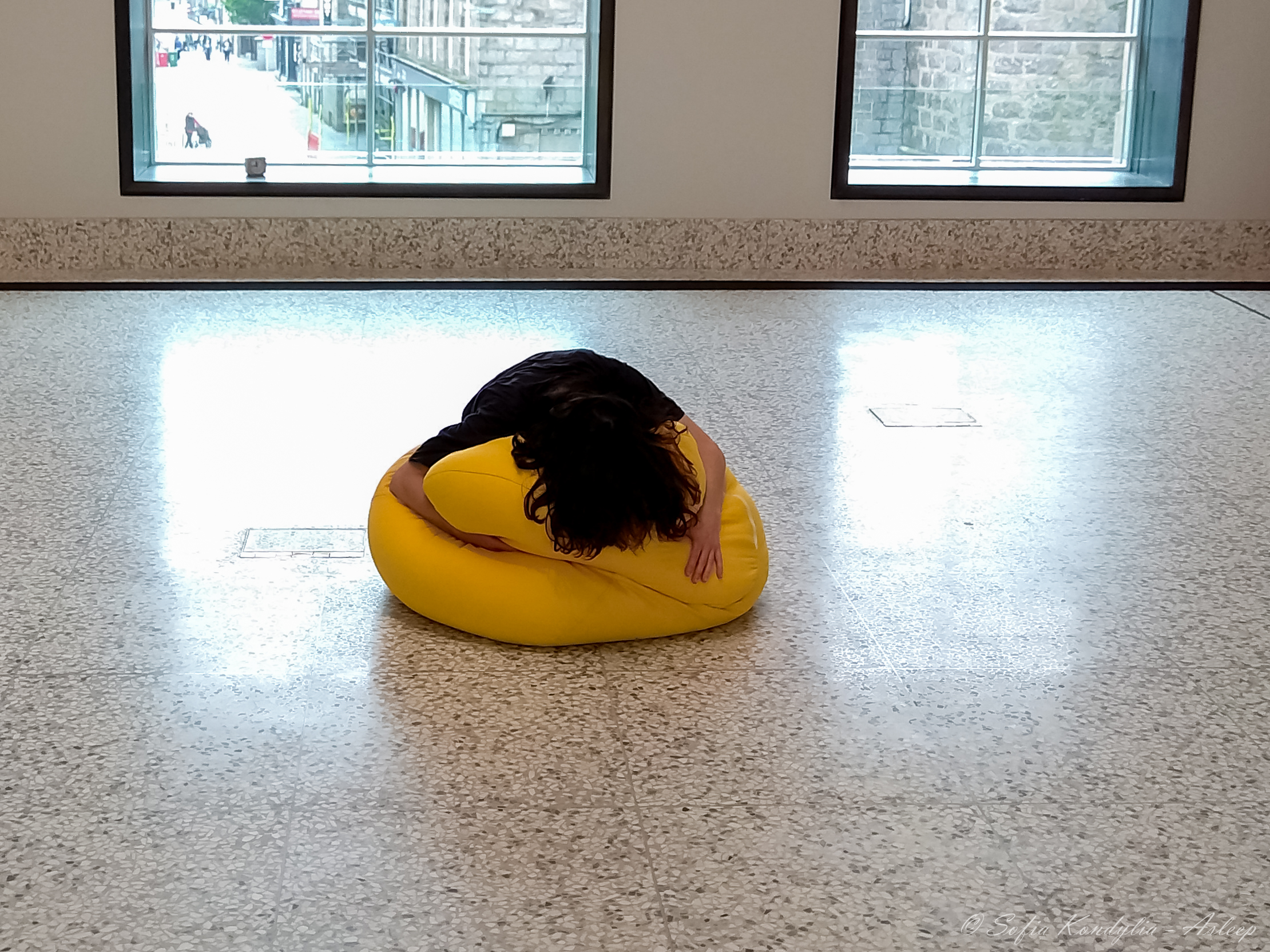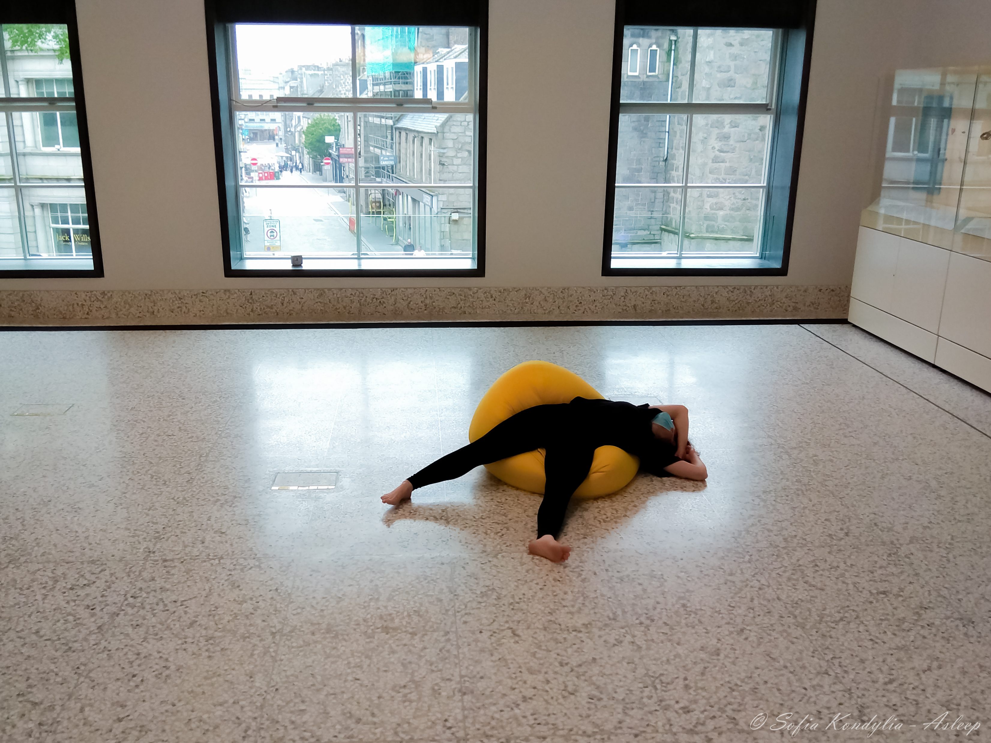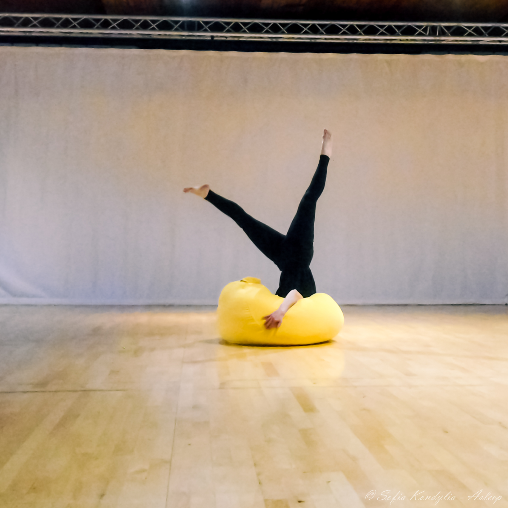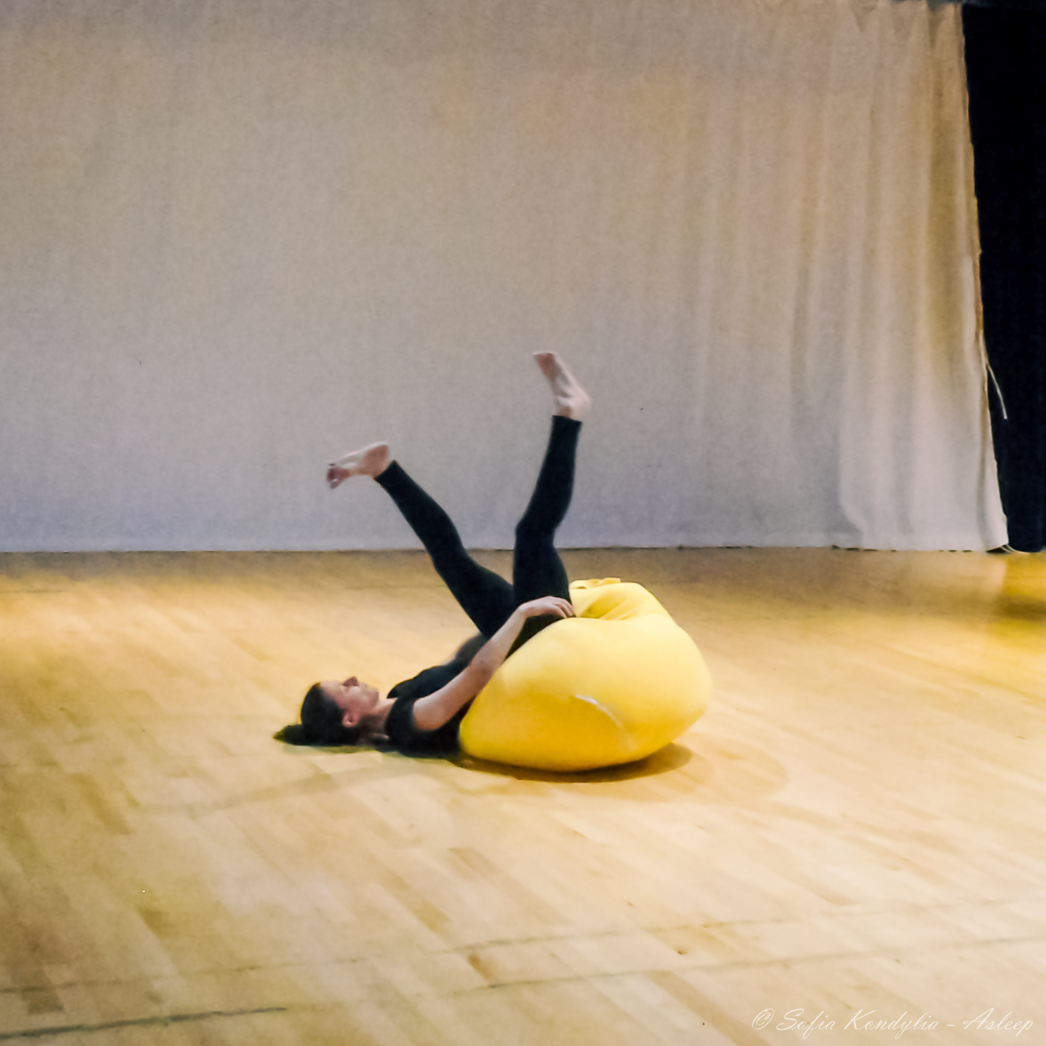 Asleep is a pop-up performance for one performer, one domestic object for rest (a bean bag pillow) and a circulating audience. The piece is discussing the body’s creativity and imaginative possibilities during the social distancing restrictions applied for Covid-19 pandemic. It creates an analogue to this “global pause” through bringing the body of the performer in a state of continuous “sleeping” mode. Drawing inspiration from the interchange between REM (dreaming) and non-REM (non-dreaming) sleeping cycles, the performer remains with her eyes dreamily closed, becoming intimate with, but also dependent upon her inhuman partner, as they whirl together between unpredictable movement, reality, and the subconscious.