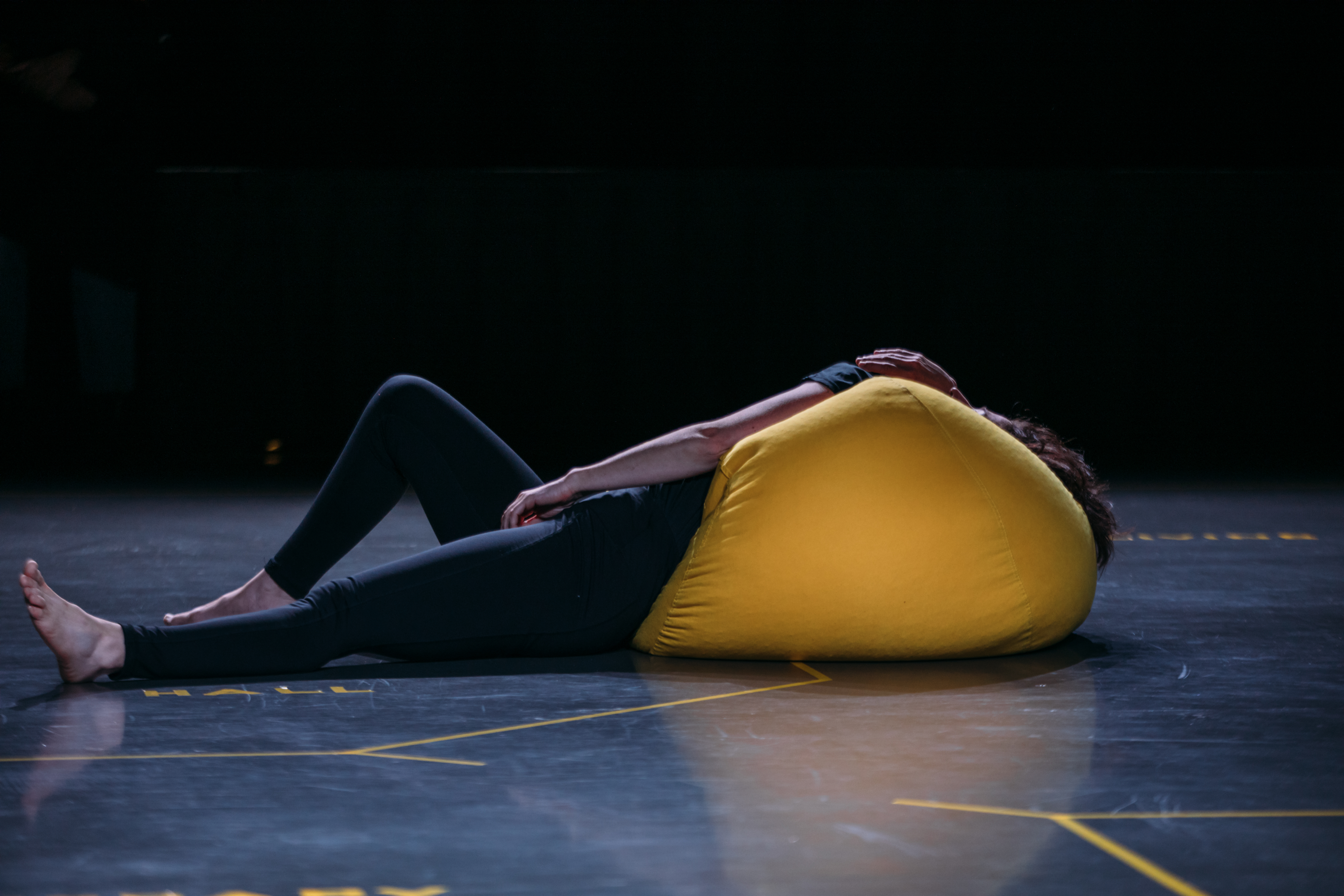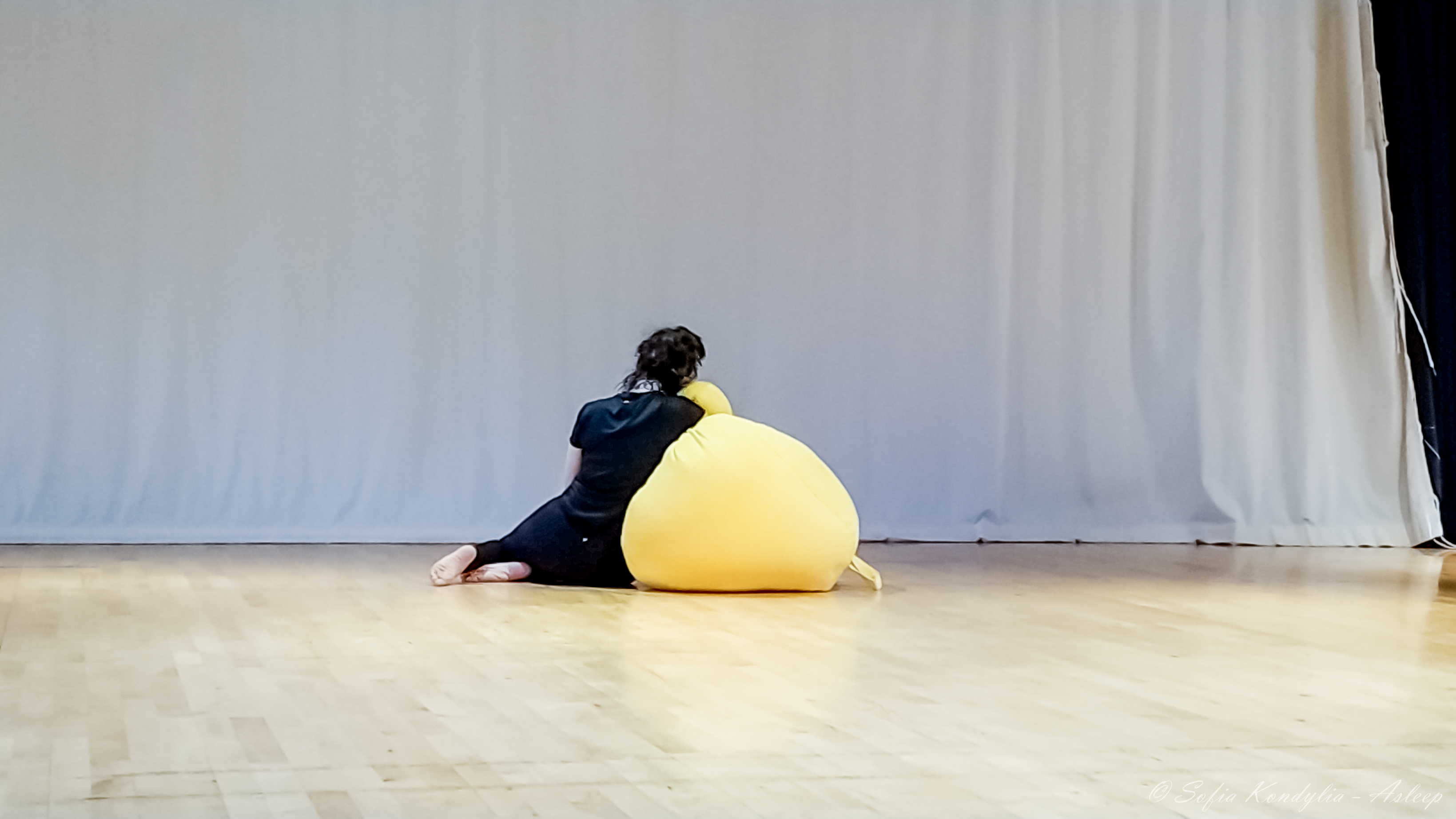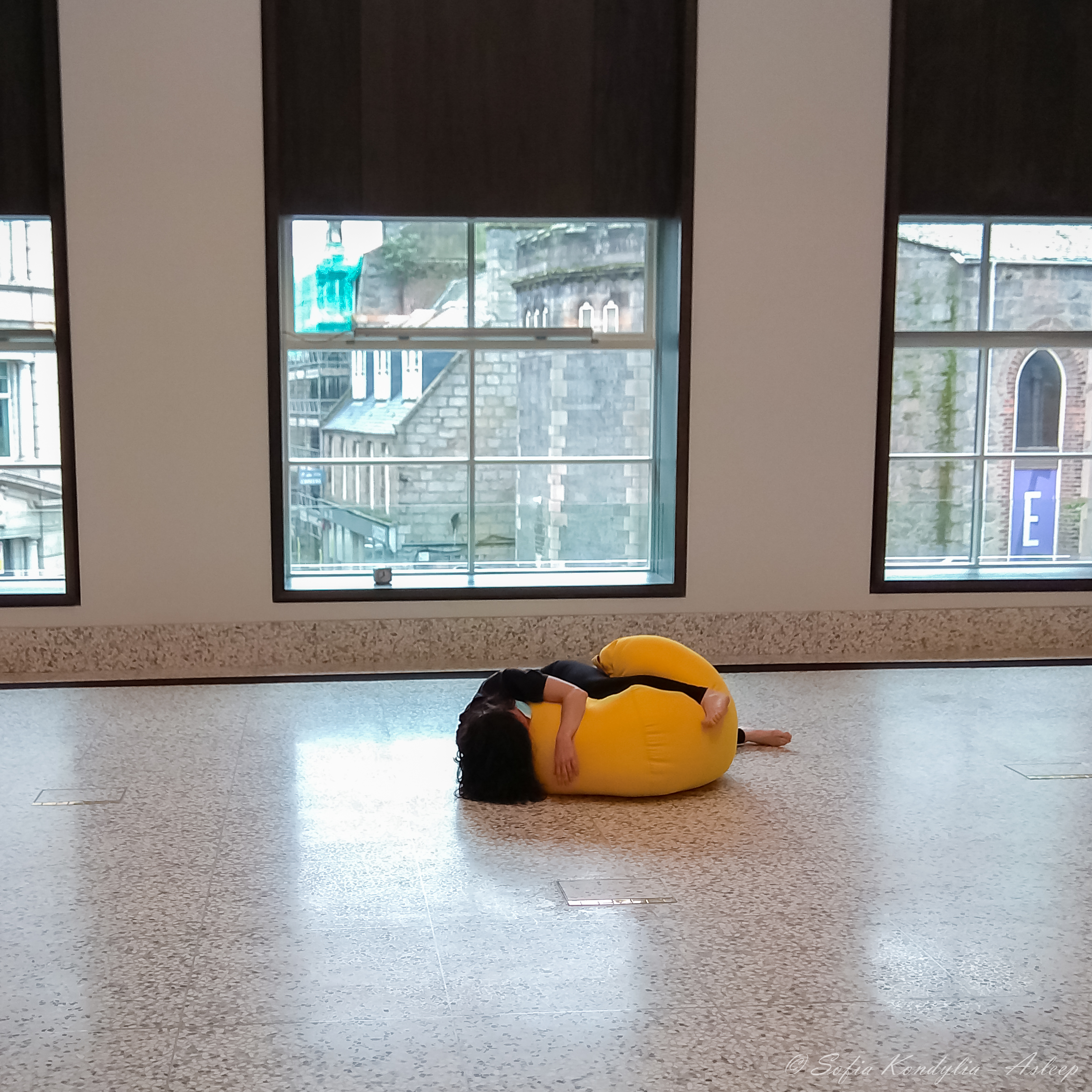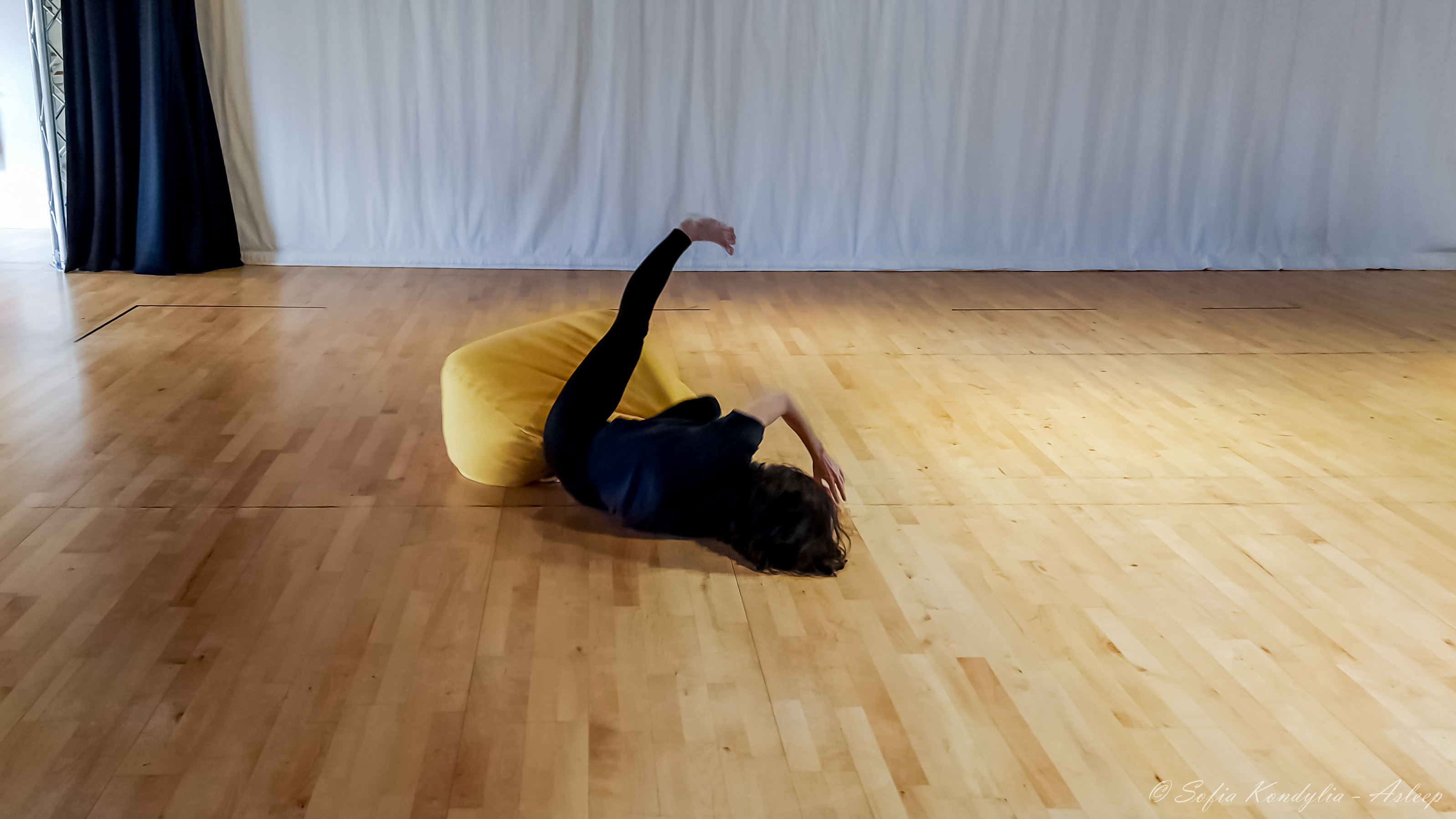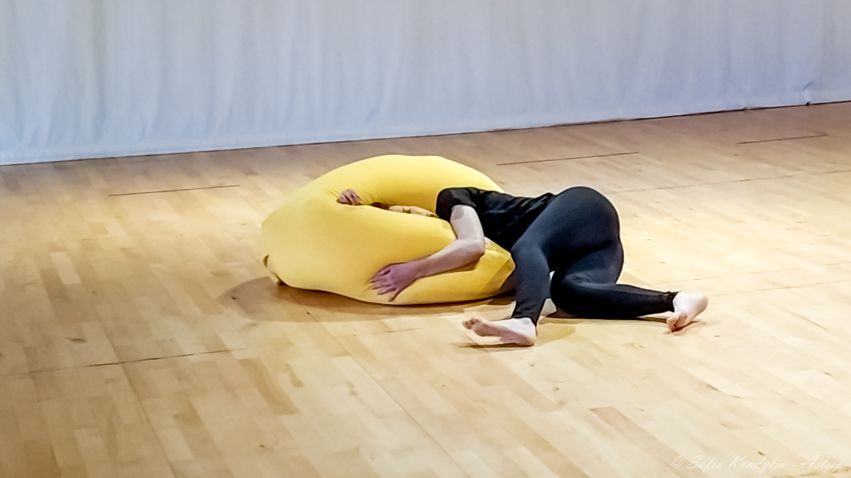 Asleep is a pop-up performance for one performer, one domestic object for rest (a bean bag pillow) and a circulating audience. The piece is discussing the body’s creativity and imaginative possibilities during the social distancing restrictions applied for Covid-19 pandemic. It creates an analogue to this “global pause” through bringing the body of the performer in a state of continuous “sleeping” mode. Drawing inspiration from the interchange between REM (dreaming) and non-REM (non-dreaming) sleeping cycles, the performer remains with her eyes dreamily closed, becoming intimate with, but also dependent upon her inhuman partner, as they whirl together between unpredictable movement, reality, and the subconscious.