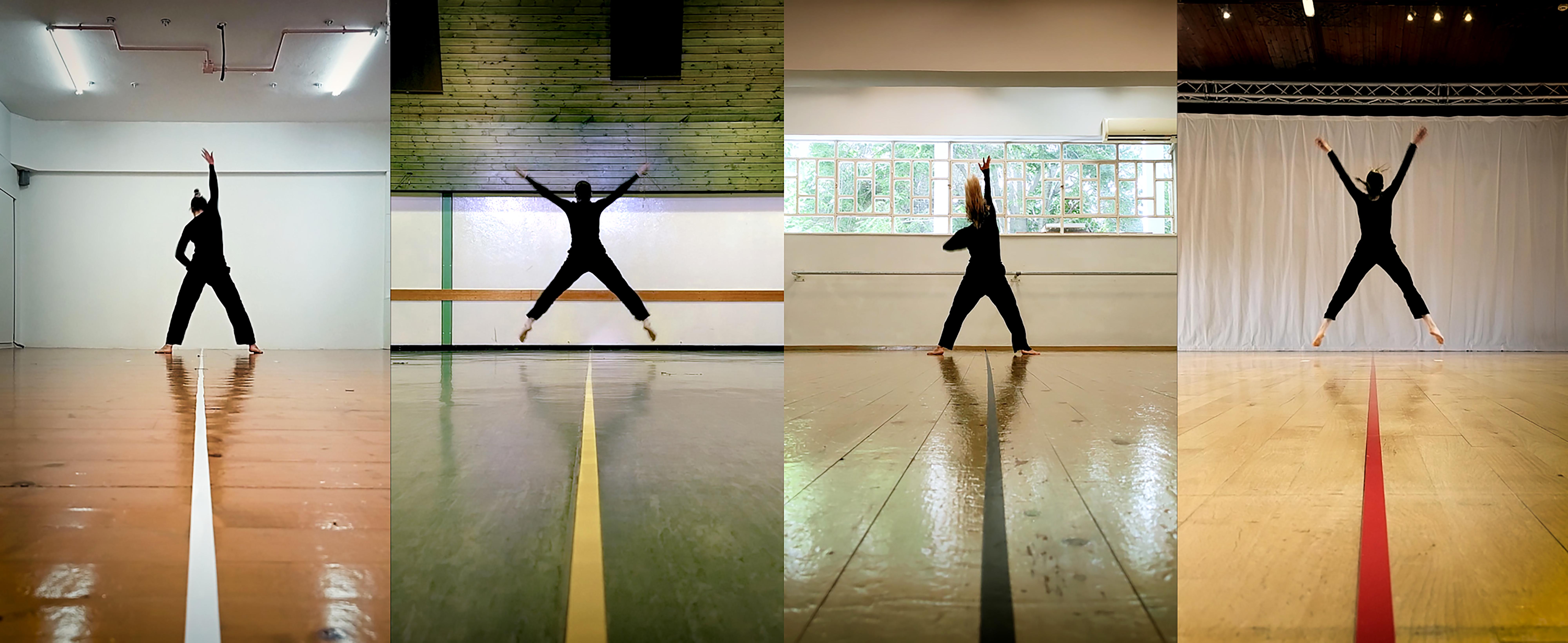 A virtual dance ensemble in their final rehearsal of a set choreography piece for four dancers and one screen.