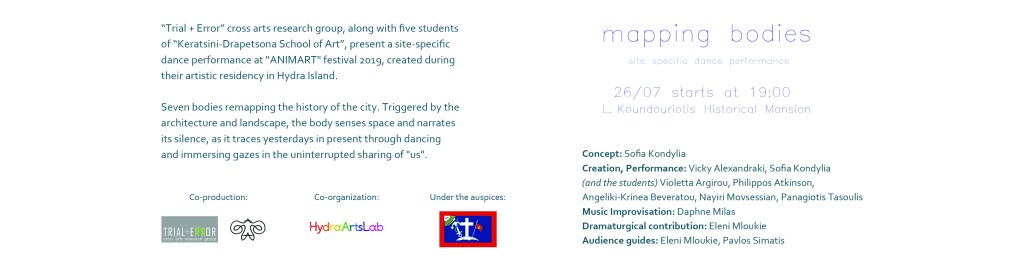“Trial + Error” cross arts research group, along with five students of “Keratsini-Drapetsona School of Art”, present a site-specific dance performance, created during their artistic residency at “ANIMART” festival 2019 in Hydra Island.