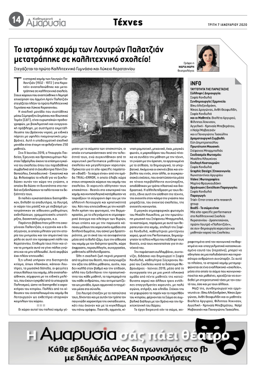 Μια πολύ πρωτότυπη παράσταση -με την υπογραφή της Σοφίας Κονδυλιά και τη συμμετοχή μαθητών- δημιουργήθηκε μέσα από επιτόπια έρευνα στο χώρο του Καλλιτεχνικού Σχολείου Κερατσινίου που ενσωμάτωσε στα «σπλάχνα» του το χαμάμ που λειτουργούσε εκεί για 40 ολόκληρα χρόνια.