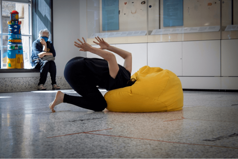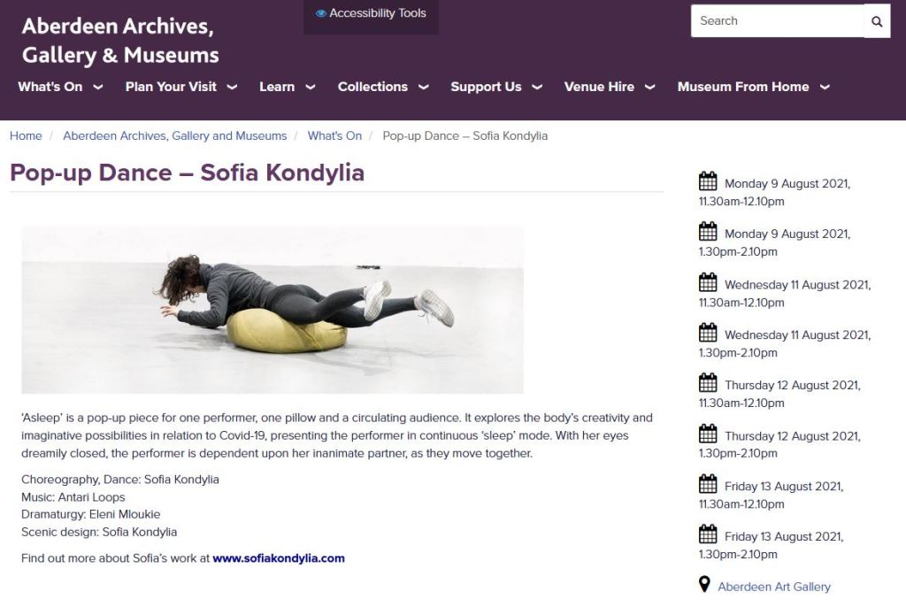 […] Next, we moved over to where Sofia Kondylia was performing Asleep (a pop-up performance, part of the programme of activity orangised in Aberdeen to complement BAS9). I made myself comfortable on the Art Gallery floor, camera poised in my hand. She began. Her movements were slow and beautiful, constantly connected with a bright yellow beanbag. The music was calming, relaxing and almost tribal. The shapes she made were stunning, her eyes forever closed. She told stories with her movements and actions, and I watched her, transfixed. After a few minutes of enjoying this performance, I stood up to leave. Later Sally and I discussed how the plain black and simple attire Sofia had chosen to wear, contrasted with the bright yellow beanbag she danced with, and how this had added to her performance. […]